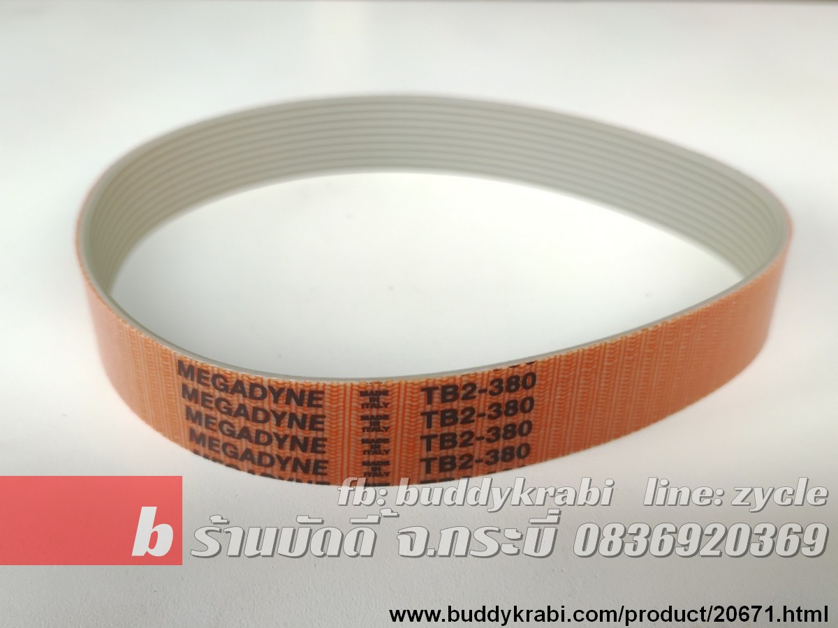 สายพานเครื่องหั่น (สไลซ์) เนื้อแช่แข็ง MEGADYNE เส้นรอบวง 385 มม. กว้าง 20 มม. หนา 2.5 มม. 10 ร่อง โพลียูรีเทน TB2-380-10 Rib-20mm สีส้ม